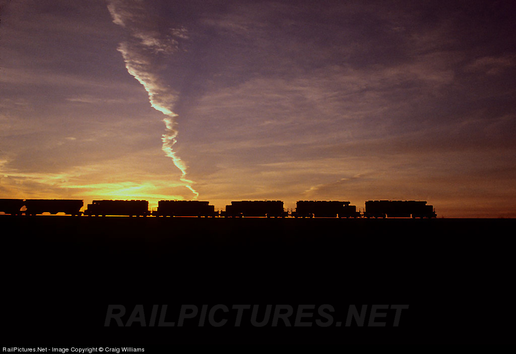| 5 units power this Marquette, IA to Mason City, IA freight west as the sun sets on another day. This train is at MP 37, which is 37 miles west of Marquette. The 378/377 trains were the daily freights between Mason and Marquette that moved all the traffic out of those 2 towns and all points in between. |