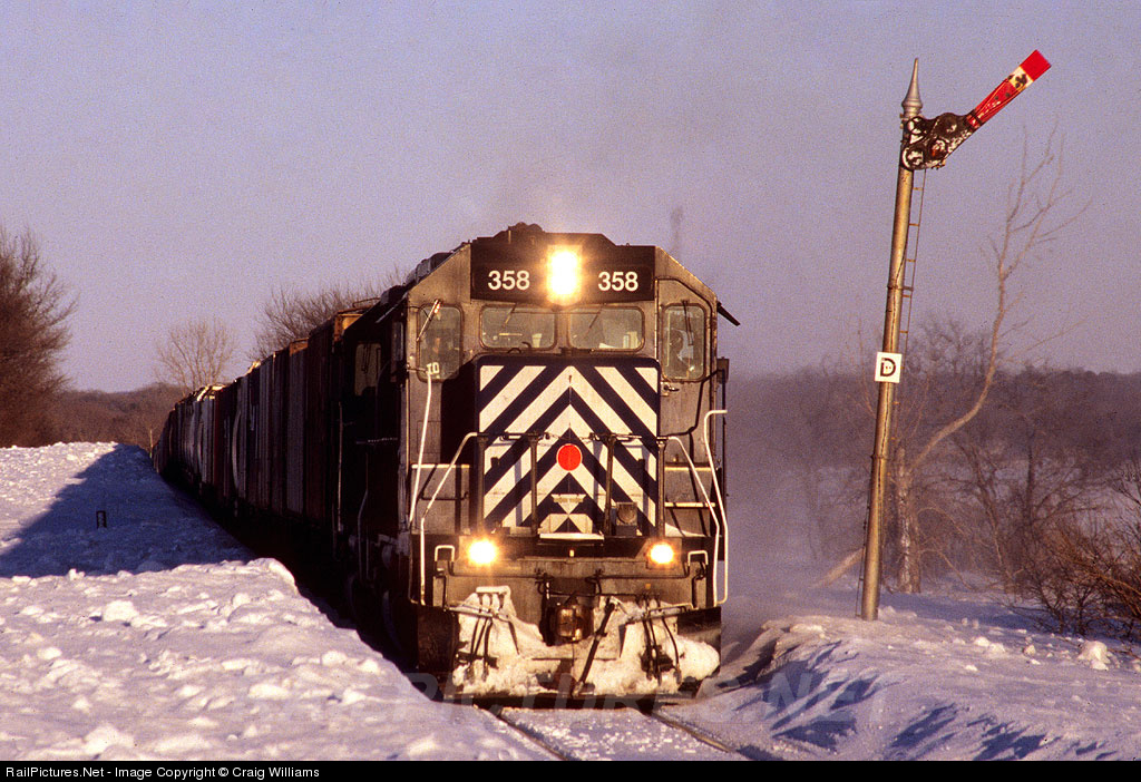 | The Mason City switch engine took some road power over to Nora Springs to pickup some empties off the Iowa Northern and bring them back into Mason City. Here the 358 west is climbing out of Nora Springs past the eastbound distant signal for the diamond at Nora. The snow gets pretty deep in here in hard winters. |