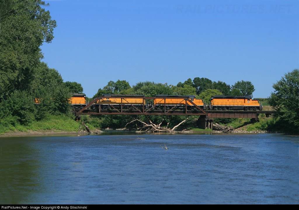 A southbound rock train for Sioux City crosses the Big Sioux River. Older power is subbing on this day because of a minor derailment at the Dell Rapids yard.