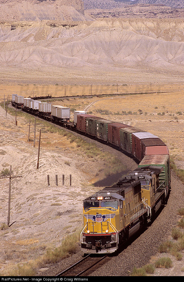 This goes back to the days when the UP ran a short Z-train between Denver, Co and Salt Lake City, UT over the ex-Rio Grande. This train has now either been dropped or run via Cheyenne, WY. Here the train is westbound near Thompson, UT with a pretty standard train in those days of box cars and UPS vans.