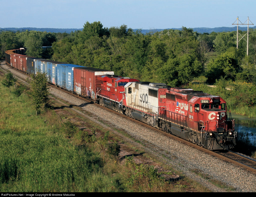 | CP 5916 leads CP's HOT Ford Fast train 185 is making good time with two EMD's and a GEVO. Anybody who attempts this shot is forewarned NOT to stop in the the breakdown lane unless the train will be there in LESS than 1 to 2 minutes. Try to plan this shot by pulling past the guardrail and into the grass and walk back. Since this a good location for light in the late days of summer. |