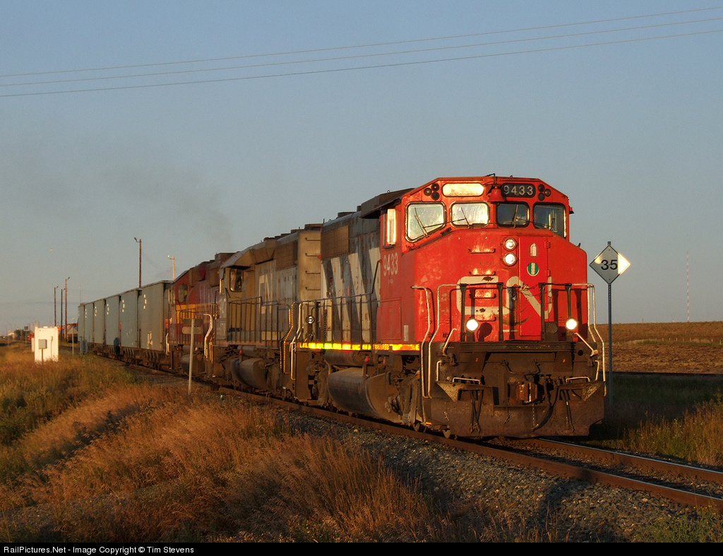 | After a 66 car set-off at Scotford (they had 205 cars out of Edmonton), A452 departs behind CN GP40-2LW 9433, GTW SD40-3 5947 and WC 2006 with 139 cars for CN's Prairie Northline. |