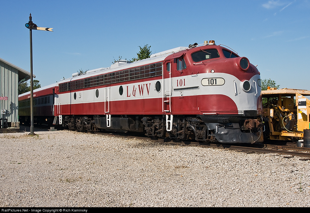 | LWV 101 sits at rest in the Lorain & West Virginia Railway yard in Wellington, Ohio. She is an E8A built in 1950 and currently operated by the L&WV in excursion service. |