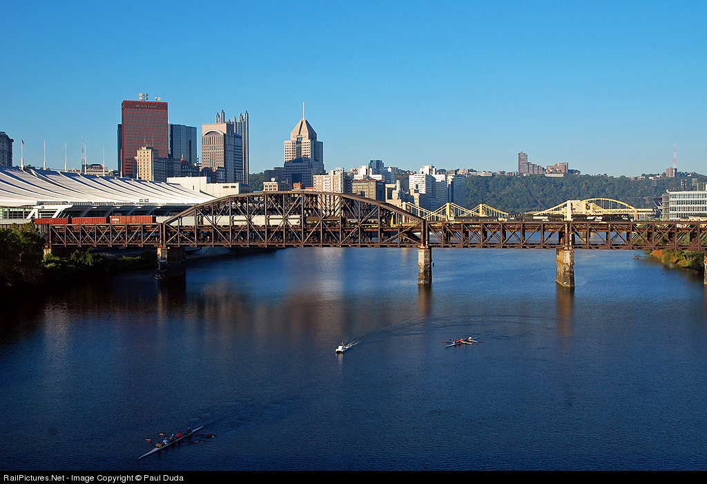 | 11V starts out a beautiful Labor Day by heading west across the Fort Wayne Bridge on the NS Pittsburgh Line in downtown Pittsburgh. Some boaters also enjoy the Holiday below on the Allegheny river, completely unaware of the train above them. |