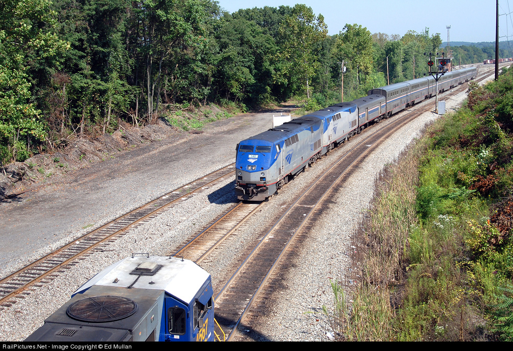 The Cap glides out of Cumberland, heading east. It has just crossed over to the east bound main, having made a station stop at Cumberland on the more passenger friendly west bound main. CSX 4567 waits for it to clear, coming into Cumberland with a string