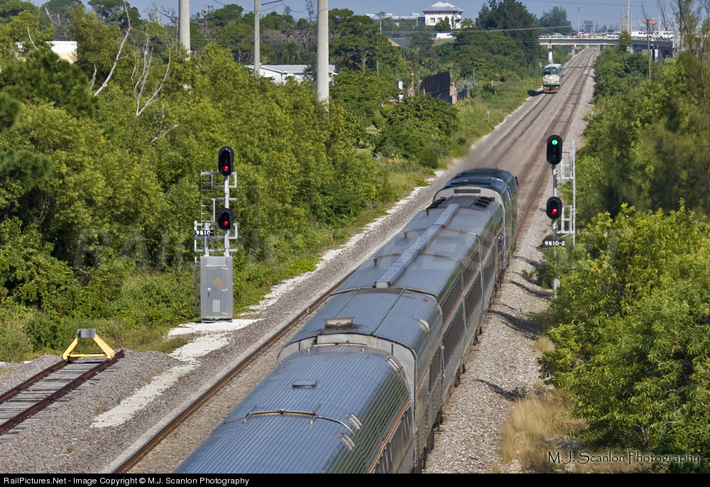 Amtrak's Silver Star blows through the RTA's Boynton Beach station as Tri-Rail 803 approaches with the P621 train.
