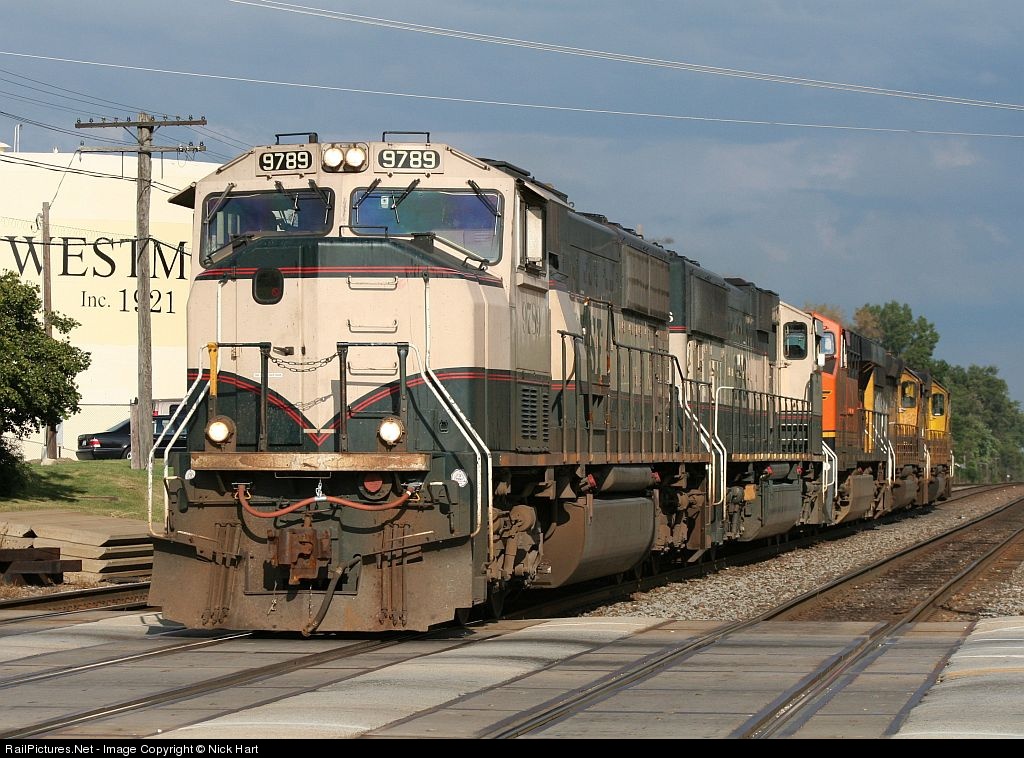A pair of Executive SD70MAC's, an H3 GEVO and a pair of Bluebonnet SD40-2's hustle light through Westmont, bound for Eola where they will pick up their train that's destined for Havre, Montana. From Eola, the GEVO and two SD40-2's would be the power.