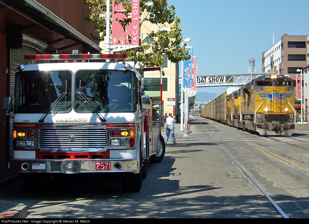| While the firefighters run into Starbucks for coffee, their firetruck stands proud next to the 7,500 foot autotrain rolling down Jack London Square. |