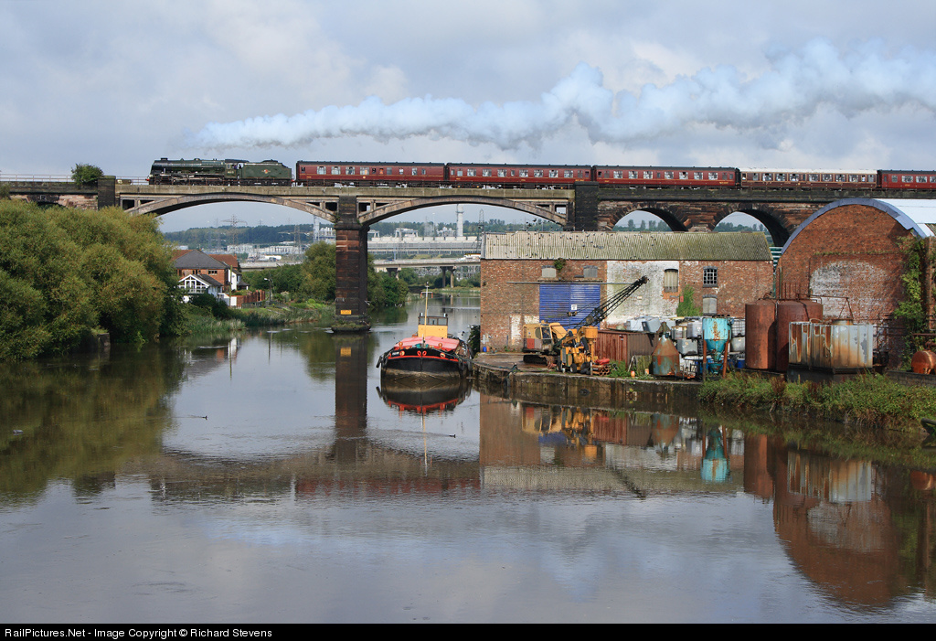 Working only its second railtour since the completion of restoration in July, 'Scots Guardsman' crosses the River Weaver with a Carnforth to Chester excursion. The foreground - barge, buildings and general clutter - could be straight out of the 1960s, with only the modern industrial plant and motorway bridge, visible through the arches of the viaduct, betraying the modern era. The barge 'Panary' is the last working Mersey grain barge and dates from 1937 - 10 years after 'Scots Guardsman' was built, but 10 years before it was rebuilt to the form seen here.