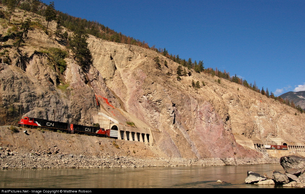 A CN westbound freight makes its way through a series of tunnels along side the Thompson River