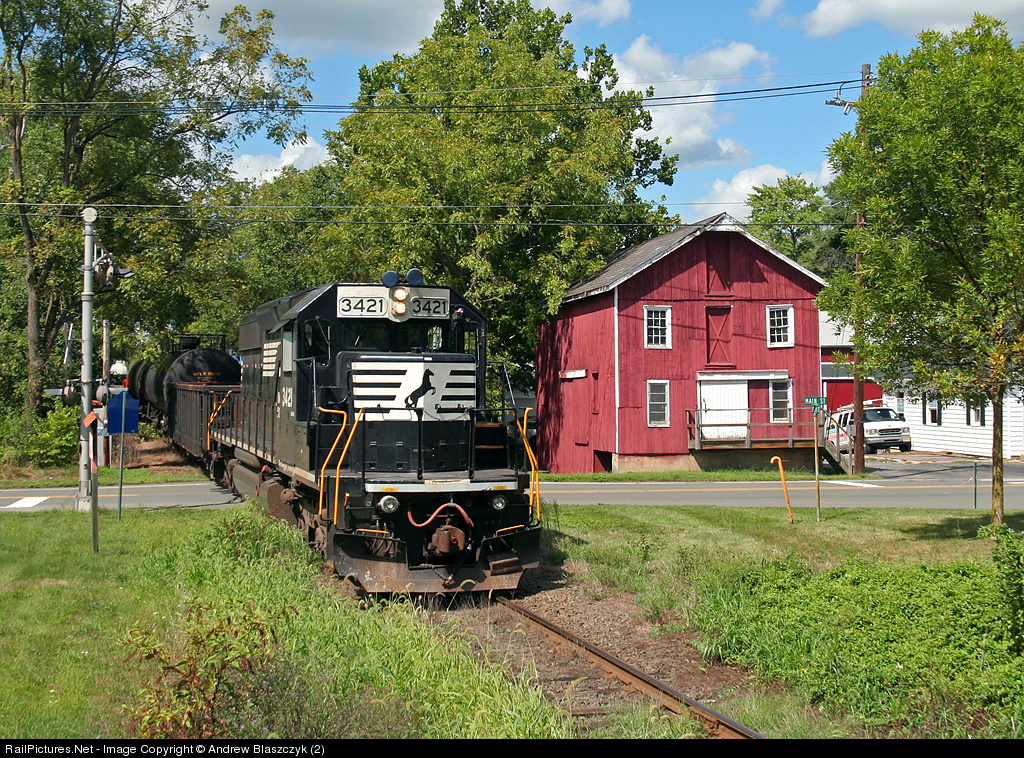 | NS local H76 behind NS 3421 backs cars for the Black River & Western interchange across Main Street in 'downtown' Three Bridges, NJ on a beautiful summer day. |