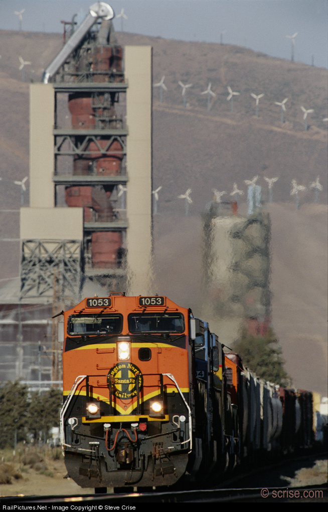 | A BNSF General Electric C44-9W # 1053 is westbound leaving Monolith approaching the summit at Tehachapi, Calif. July 5th, 2002. Steve Crise Photo. © scrise.com |