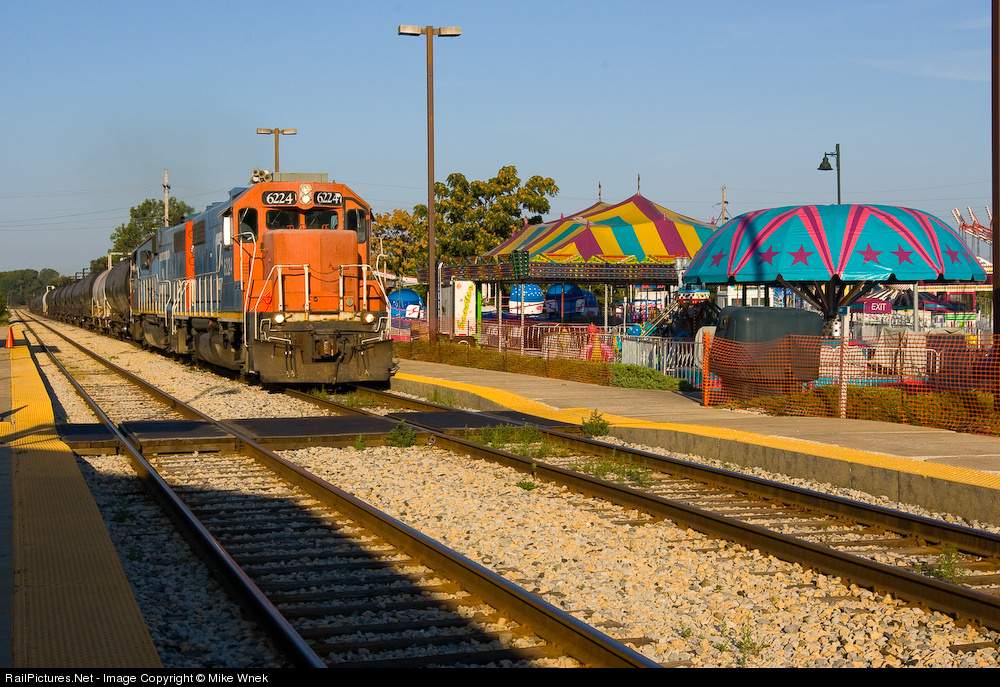| Far too early in the morning, GTW 6224 leads the Oil Job eastbound past Lemont's Kickapoo Days, which will open in only an hour or two. |