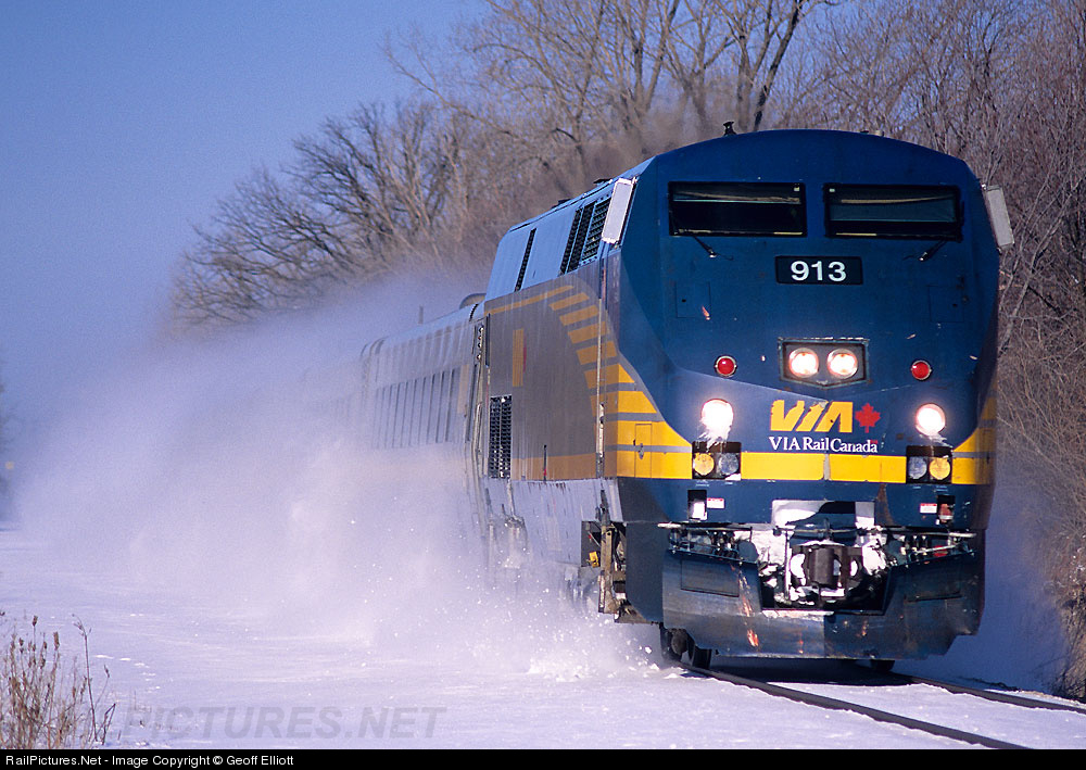 | VIA 913 has charge of #72 as it kicks up snow as he heads for Toronto on this sunny, but cold, March morning. |