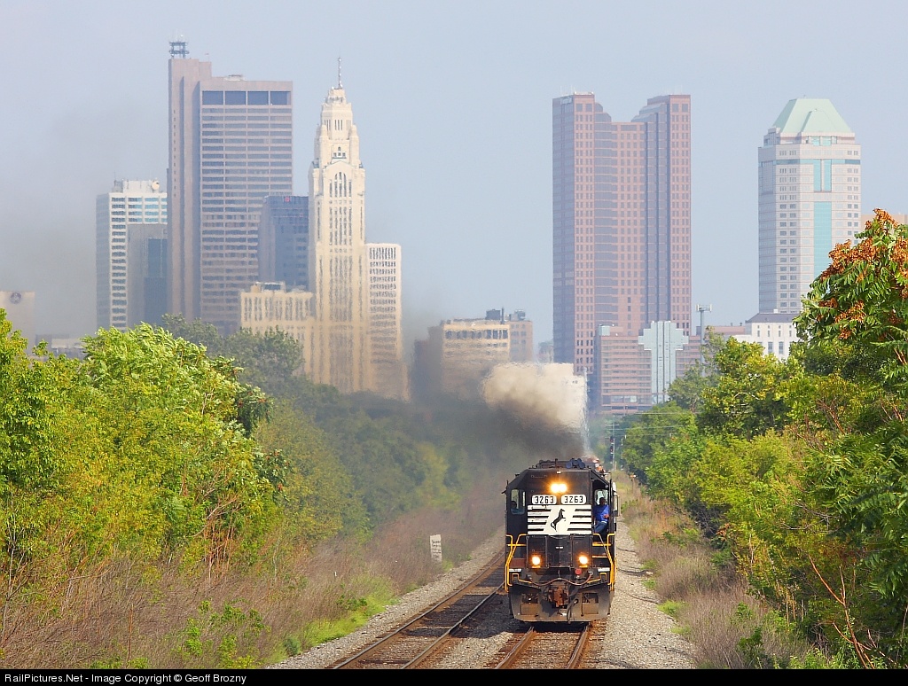 | NS 381 having just came off the West Virginia Secondary now heads west on the NS Dayton District letting out a little bit of smoke as it climbs the grade, out of downtown. |