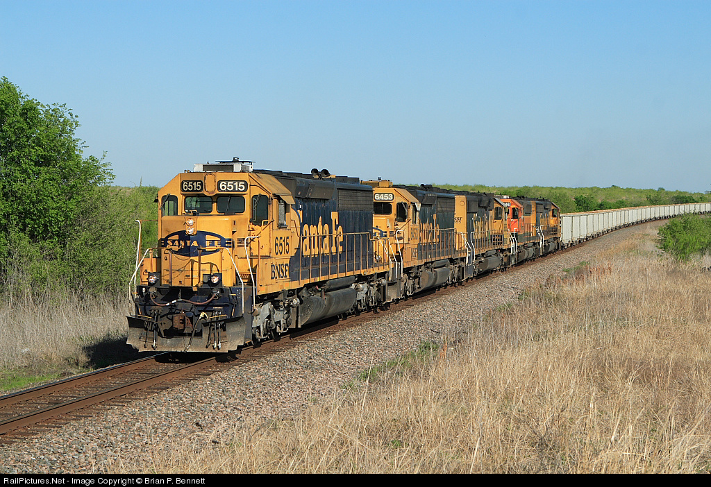 Proceeding at restricted speed, prepared to follow another westbound into the hole at Rogers to meet an eastbound, the engineer of VULX empties prepares to transition out of dynamics and power out of the sag west of the Hwy. 190 overpass. On the point is SD45-2 6515, completed in May '72 as AT&SF 5638.