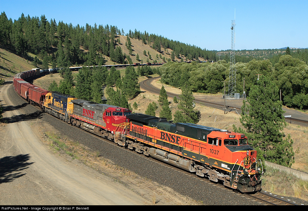 A Pasco-bound manifest negotiates Marshall Canyon behind H1 Dash-9 1037, Warbonnet 826, and very neat SD40u 6309 (ex-ATSF SD40u 5009, nee-ATSF SD40 5009, nee-SD40 1709, built 4/66). Although not a real aesthetically pleasing lashup, it is very neat nonetheless. Also, Scooter is the best railfanning copilot in the world.