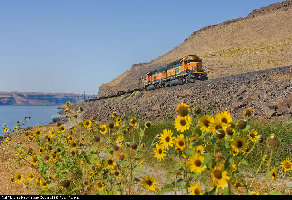 A pair of SD40-2's lead an empty baretable off the controlled siding at Bates, passing a group of wild sunflowers growing along the picturesque Columbia River.