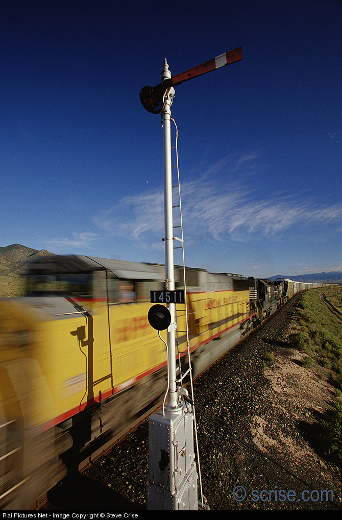 | A Union Pacific freight train is making time as it speeds safely past a Union Switch and Signal Style B semaphore at Coyote Siding, MP 14511, near Carrizozo, New Mexico on September 11th, 1999. Steve Crise Photo © scrise.com |