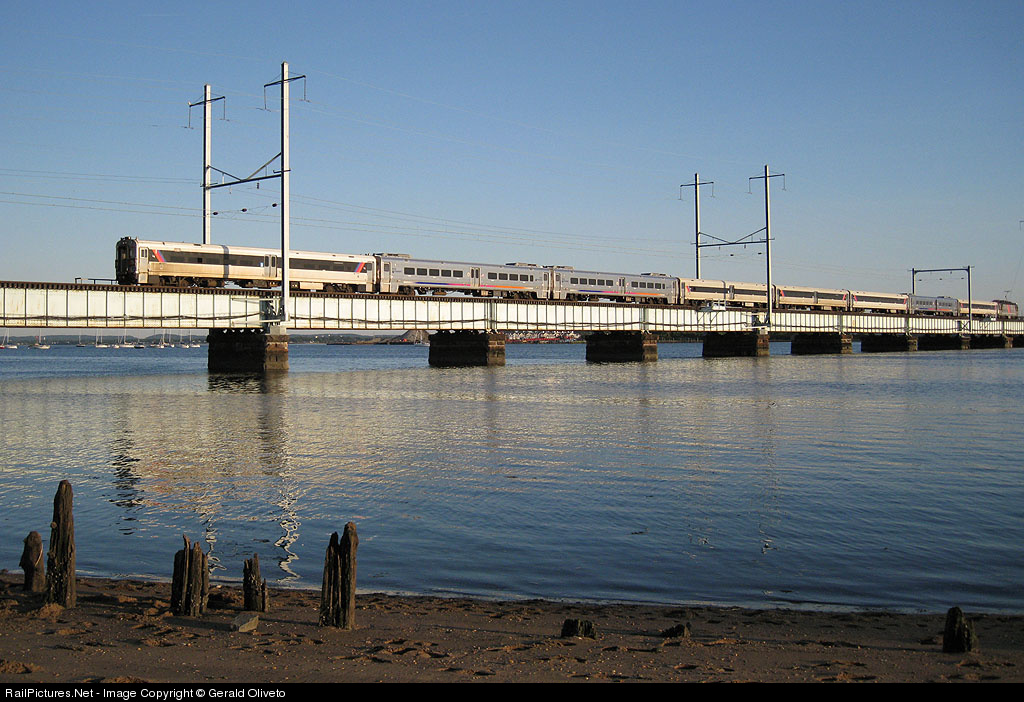 With a mix of just about every type of Comet car in its consist, a westbound train to Long Branch crosses the Raritan River during the evening rush.