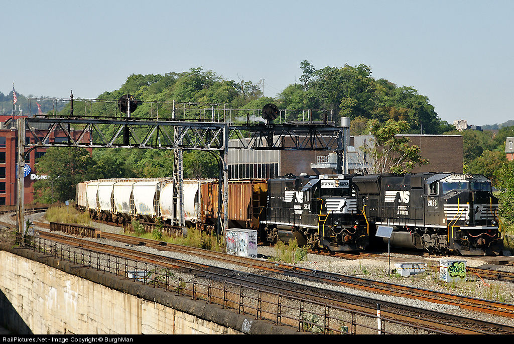 | A pair of trains pass through Federal Street. NS 5626 is on the rear of the C38 local. On the right is Herzon ballast train 921. Although the tracks are side-by-side, the C38 is on the Conemaugh Line while the Herzon train is on the Ft. Wayne Line |