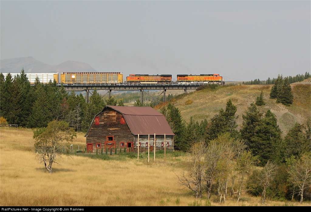 Passing the most photographed barn in Montana, this vehicle train crosses the trestle spanning Two Medicine River between East Glacier and Browning.