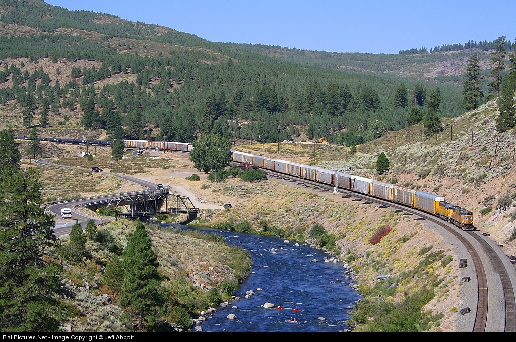 One can see the rafters in the river below as they float downstream with this eastbound manifest, as it heads toward Sparks NV, on the Roseville Sub. We stayed at a cool campground in the RV across the river from here, so had to find a shot that made it worthwhile.