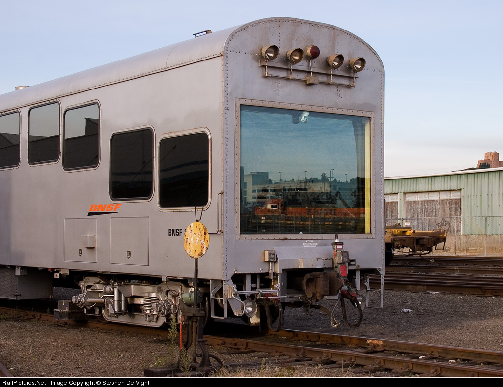 | BNSF 134 is just a glimmer in large window on the back of this track geometry car which is sitting, tied down for the night while the crew gets some rest. |