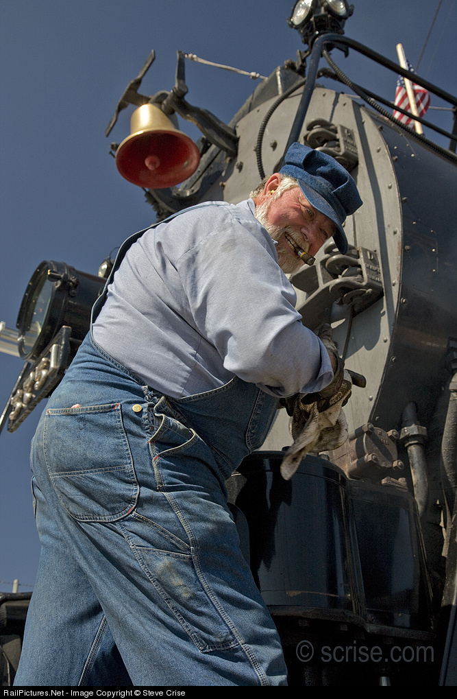 | Steam locomotive engineer Rowland Fogarty steps down from the pilot of the 3751 after finishing his inspection duties of the locomotive during a service stop at the Miramar Wye on September 21st, 2008. Rowland was the engineer on the train for the move from San Diego to the Miramar Wye and back, and from Hobart to 8th Street yards on the return leg of the trip. San Bernardino Railroad Historical Society (SBRHS.org) steam locomotive 3751 was employed to carry 24 private cars of The American Association of Private Railroad Car Owners (AAPRCO) special convention train between Los Angeles, San Diego and San Pedro. September 21st, 2008. Steve Crise Photo © scrise.com |