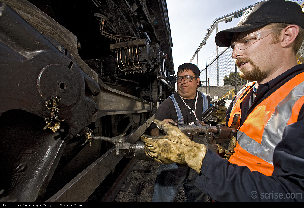 | San Bernardino Railroad Historical Society (SBRHS.org) Steam Crew members Dan Echeto and Jim Campbell grease the rods with the Alemite gun using the air pressure from the locomotive air tank. The crew is seen here at the top of the Miramar Wye performing one of the three service stops necessary during The American Association of Private Railroad Car Owners (AAPRCO) special convention train that ran between Los Angeles, San Diego and San Pedro with a 24 car train of private coaches on September 21st, 2008. Steve Crise Photo © scrise.com |
