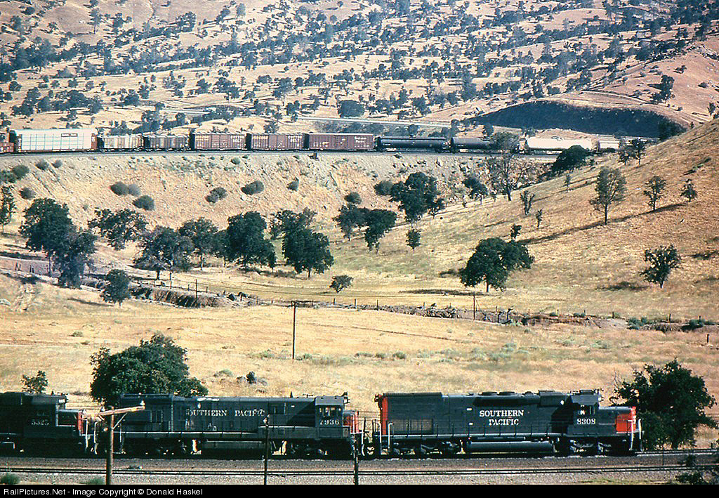 | A standard length SP freight is heading around the colossal Tehachapi Loop. Middle of train is in the upper part of photo. Rear of train is in tunnel 9 in center of photo hidden by cut. Unbelievable as it seems, this freight train is running over itself. This loop is one of the engineering marvels of the 20th century. There are other shots of this locomotive in RailPictures.To see another SP shot Click here...