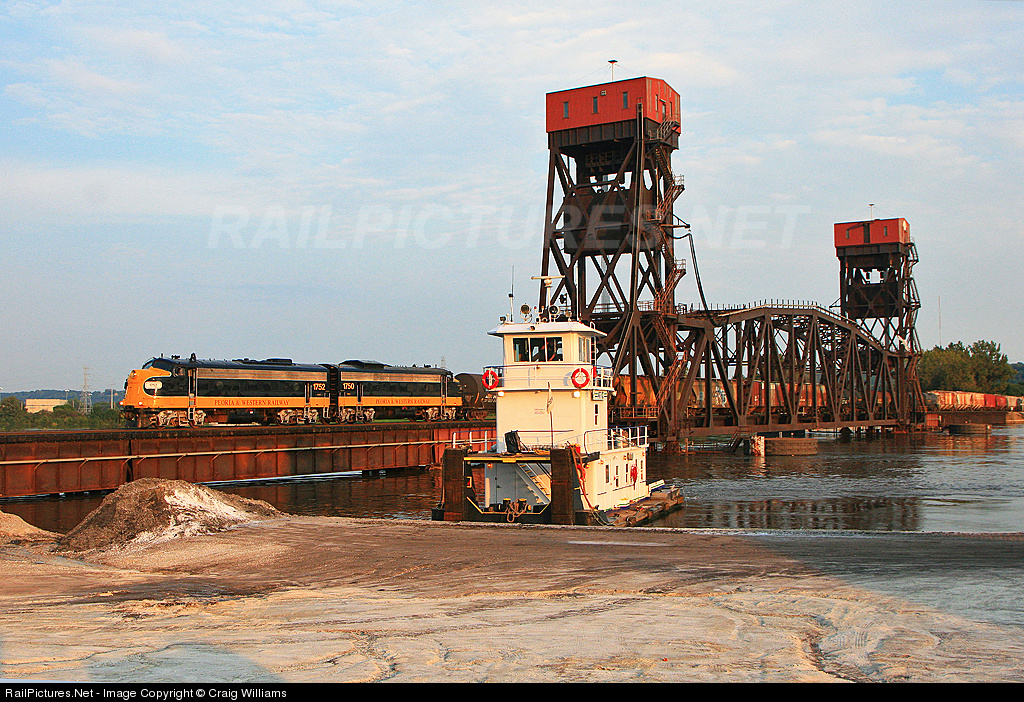 | The F-units head out TZPR's Creve Couer Yard in Peoria. This job is crossing a very high Illinois River near Bridge Jct. With the river high 3-4 tug boat crews are monitoring tugs around the river to make sure none get lose. These tugboat crews changed shifts at 6am/6pm right here at the bridge. The last boat is waiting to get back north of the bridge behind the PW. |