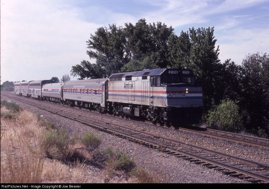 Depicts Amtrak's "Pioneer" service, which operated from Denver to Seattle, via Salt Lake City and Boise. The route was discontinued in 1997, thus leaving most of the upper Intermountain region without passenger rail service since.