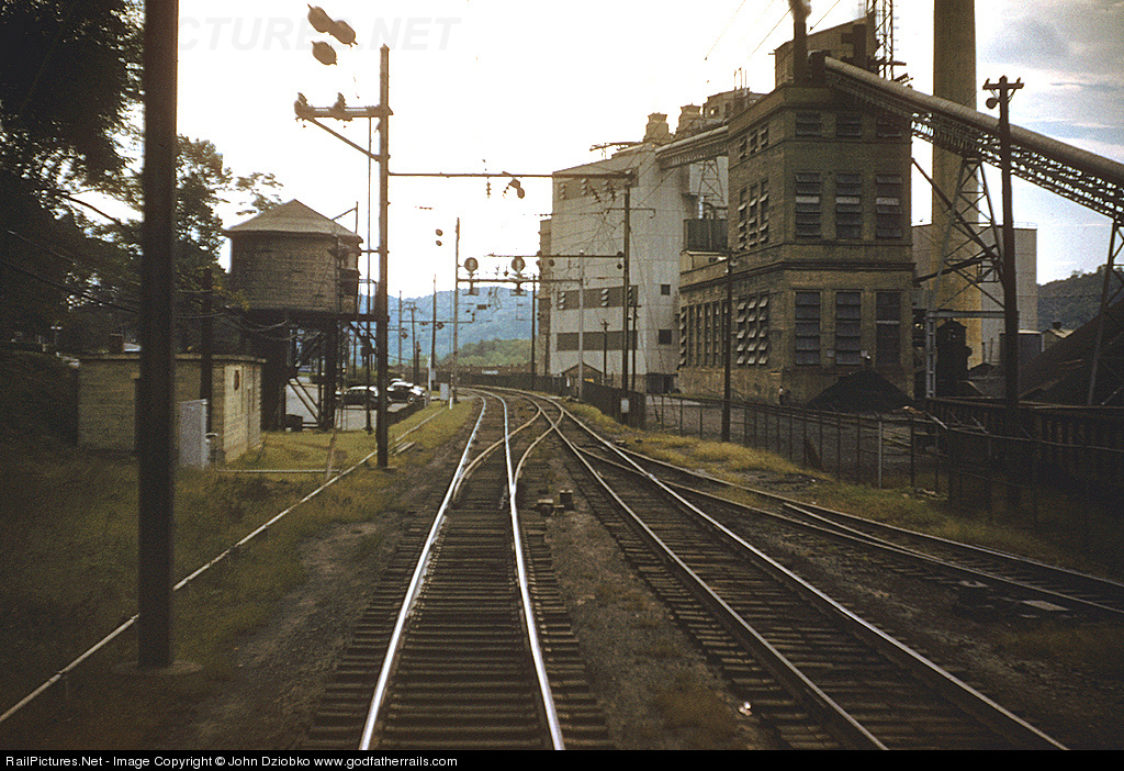 | Here's one for the modelers. You are looking out the back window of a 1954 PRR excursion down the Port Line. Today, this is known as CP Holtwood on the NS. RP.net viewer Joe Benson reports that all that remains of this scene is the interlocking crossover, PRR signal tower, and parking lot on the left. Today's Holtwood Power Station stands out of view to the right. This is still a busy route for the NS. |