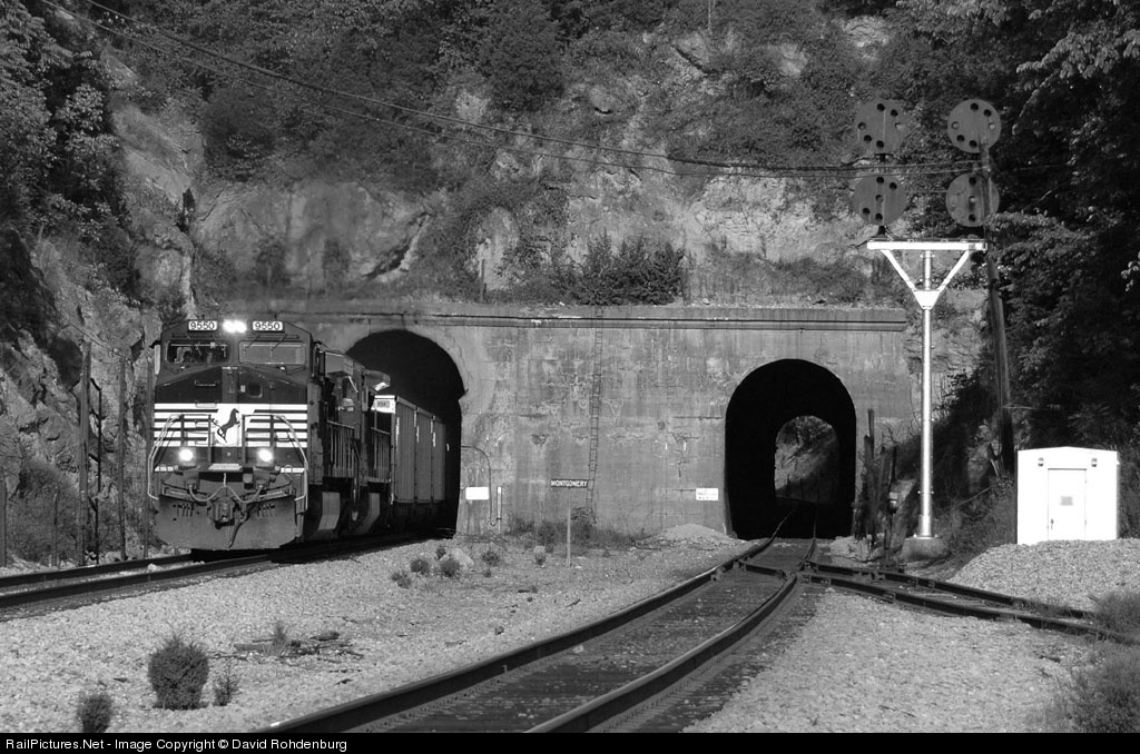 In a classic scene, NS 9550 leads a coal train westbound out of the twin tunnels at Montgomery, Virginia.