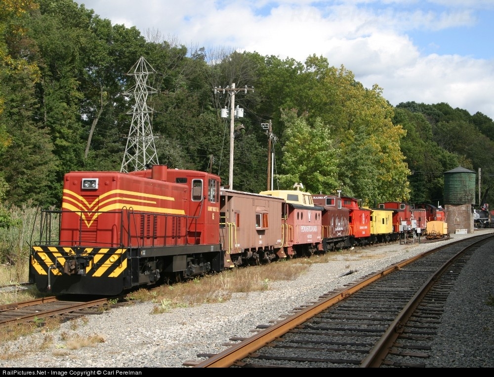 | Looks like the Rahway Valley 16 is prepared to pull a string of cabooses. Not really... the 16 is on attached to the rear end of the Whippany Railway Musuem's caboose train. This caboose train will be powered by classic RS1 21 this Sunday, October 5. |