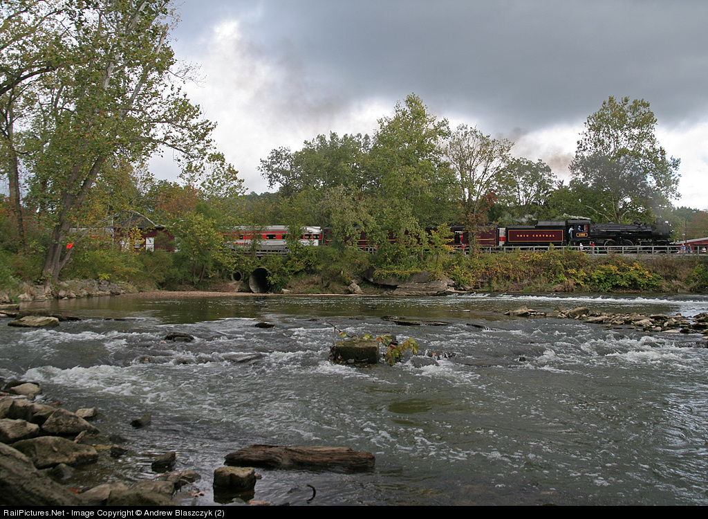 | CVSR's guest for the weekend, OHCR 1293 pulls a lengthy train through the village of Penninsula as the railroad's namesake river, the Cuyahoga flows in the foreground. |