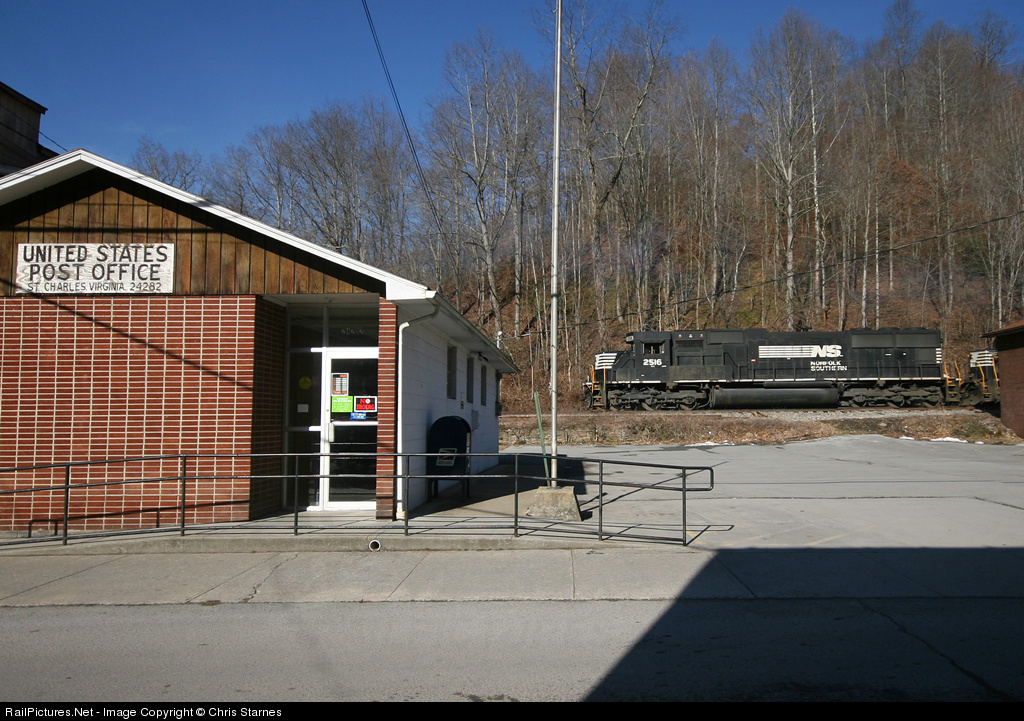 All is quiet on this Sunday morning in the small town of St. Charles as NS 2516 shoves an empty coal train by the post office enroute to its coal loadout just a couple of miles up the branch at Benedict.