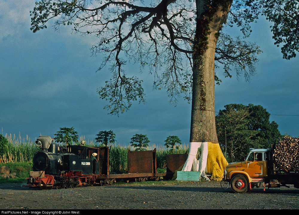 As late as 1980 steam worked on at least two sugar cane plantations on Guatemala's Pacific slope. I missed the shay, but here is Palo Gordo No. 2 switches empties in the late afternoon under a giant Cieba tree. I believe the cane lines were 30-inch gauge, but it has been a long time.