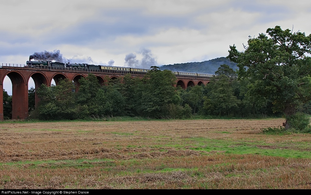 | 4936 'Kinlet Hall' and 5029 'Nunney Castle' power away from Ledbury across the viaduct with the 3 Choirs Express railtour from Nottingham. This tour used a circular route via Worcester, Hereford, Newport and Gloucester |