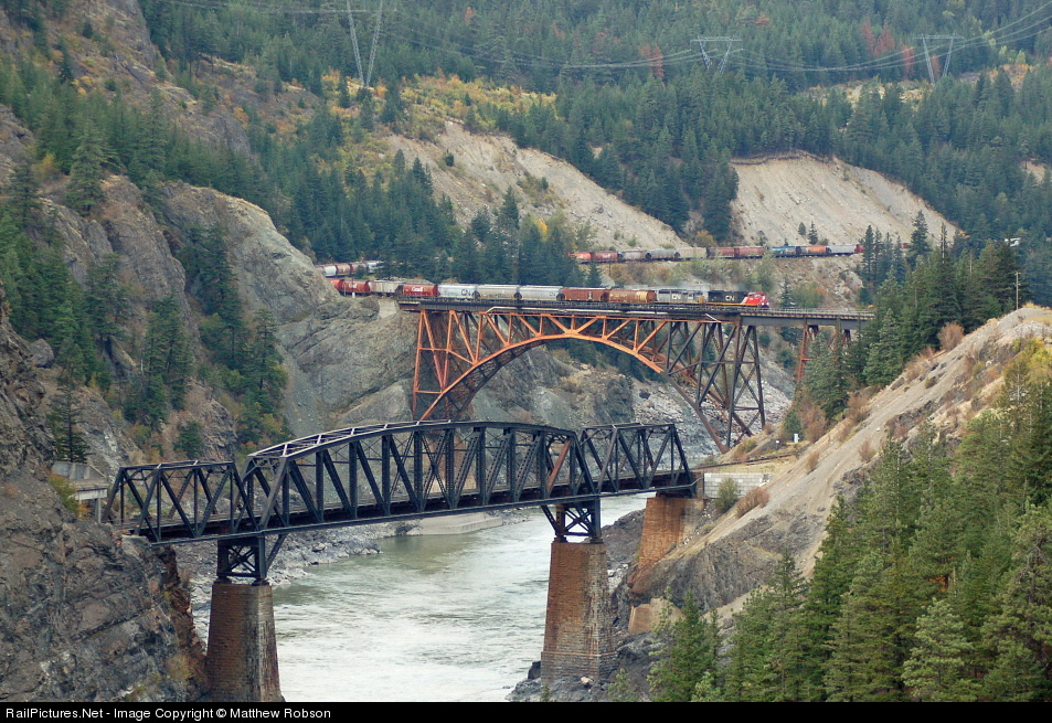 | This was a rare find, at least for me. SD40-3 GTW 5955 is the trailing unit on this Westbound grain train as they cross over the Fraser River and Canadian Pacific's Thompson Sub |