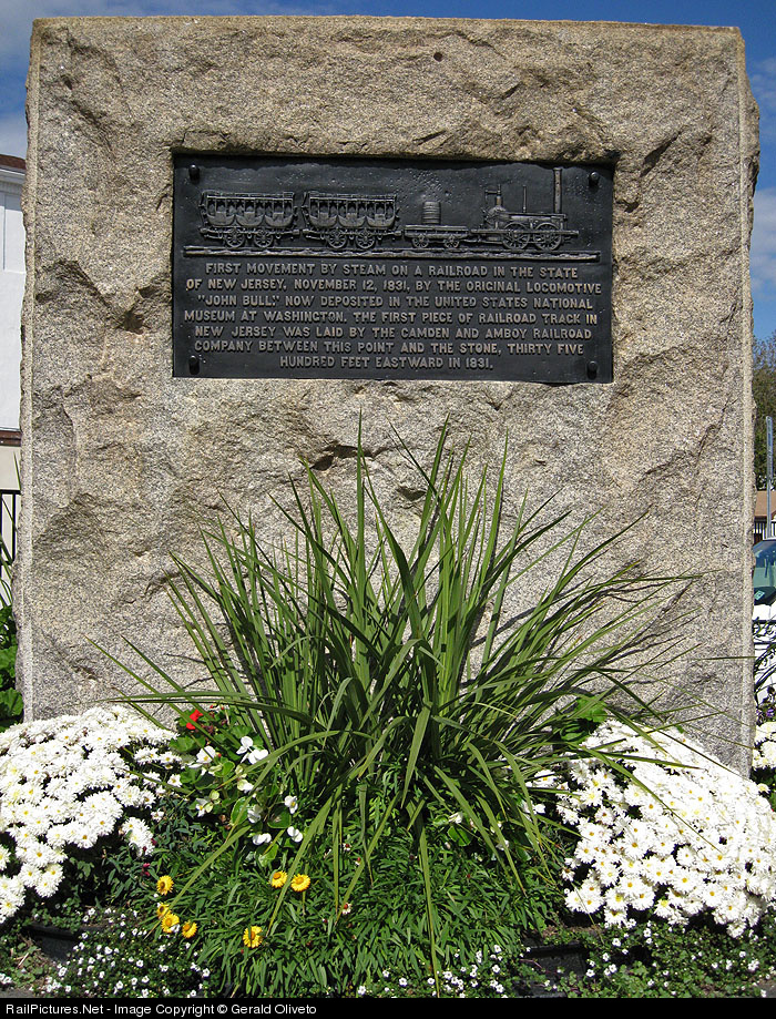 Erected by the Pennsylvania Railroad in 1891, this plaque commemorates the first steam powered railroad movement in the state of New Jersey in 1831. Originally located along an isolated portion of the former Camden & Amboy tracks, this stone monument was moved to a prominent location in downtown Bordentown by the Penn Central Railroad in 1970. The former Camden & Amboy line that hosted the first steam powered train now see a local Conrail freight three nights per week.