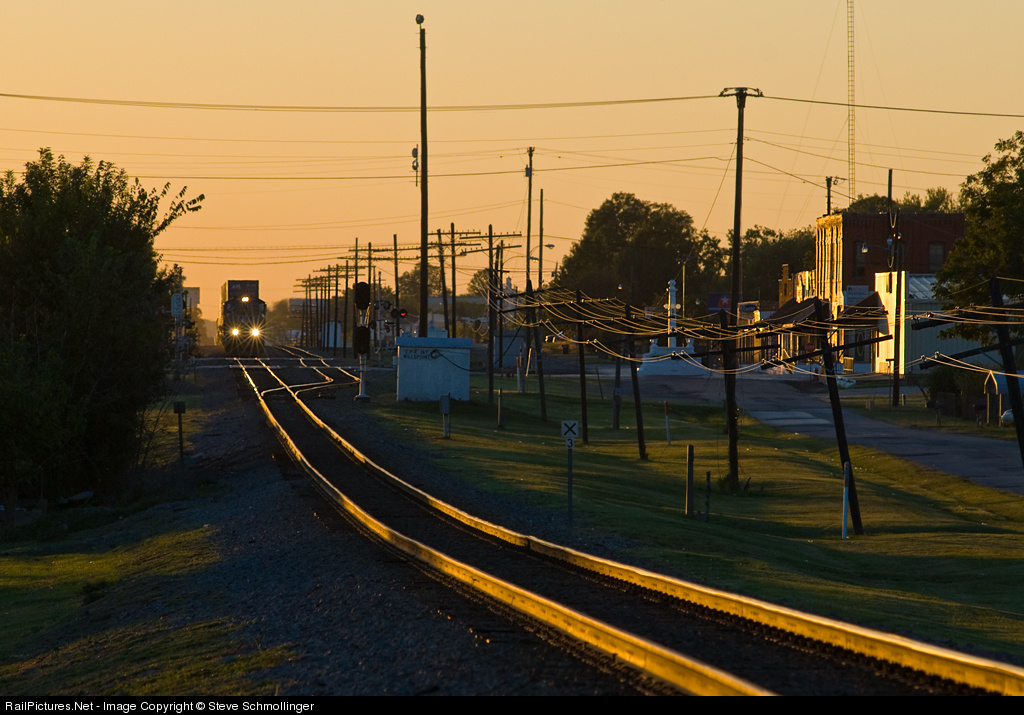 At sunset an eastbound Z train roars toward the center of Wills Point.