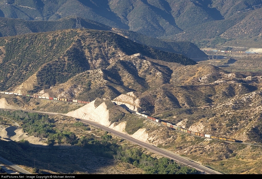 | Climbing up the old SP, northbound tonnage ascends toward Canyon while a BNSF is dropping through Blue Cut and Old Keenbrook on the other side of the mountain. |