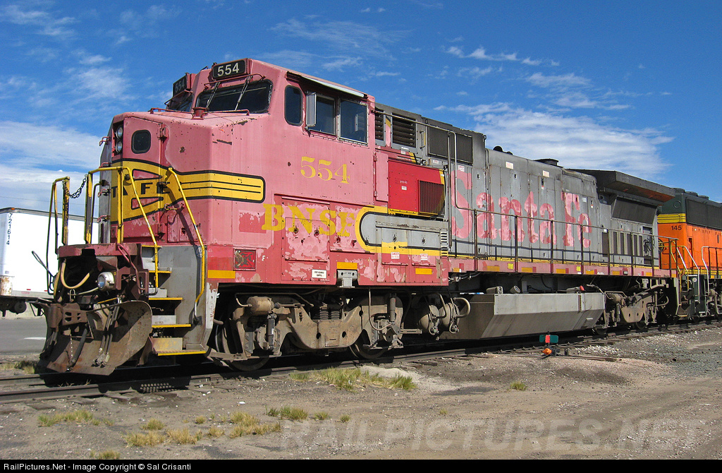 This BNSF GE B40-8W, (554), unit with its original Santa Fe warbonnet scheme, has seen lots of service over the years. By its appearance it will eventually end up at the CEECO or Mid-America paint shop, with a new heritage III scheme. This unit is currently in service on a Local that operates between Longmont and Fort Collins, CO.