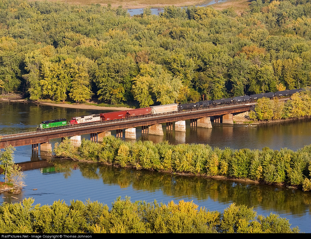 High Priority Merchandise Train from Dilworth - Galesburg heads south across the Wisconsin River Bridge.
