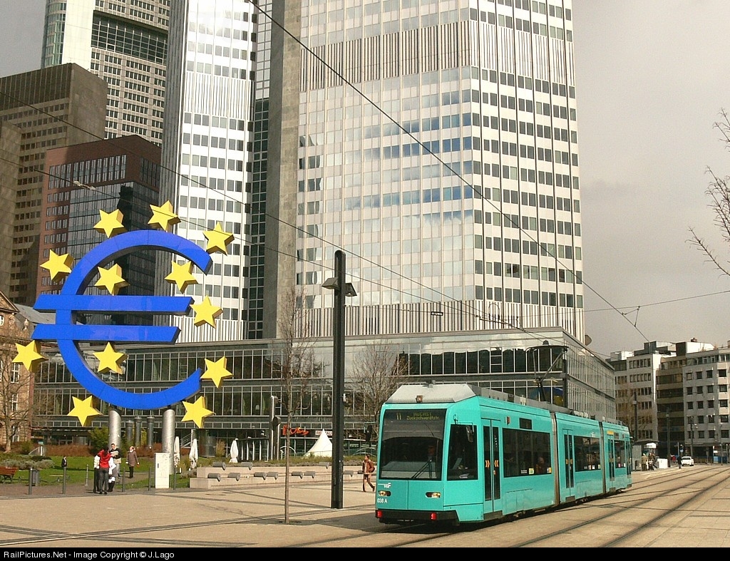 Tram depart from Billy Bradtz Platz with a "11" line service. Behind the tram the famous building of European Central Bank and too the icon of Euro currency.