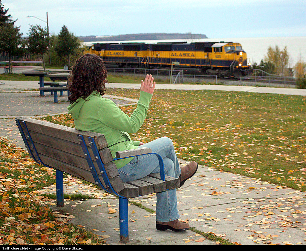 | On a quiet Sunday afternoon one of Anchorage's more attractive residents waves a friendly greeting to the head end crew on the empty AS&G gravel train winding its way slowly into Anchorage after dumping the final train of aggregate for the 2008 season. The leaves are mostly off the trees and in just a few hours this entire scene will be shrouded in white. But for a few moments the weather is pleasant enough to sit on the shore of Cook Inlet and just admire the changing of the seasons. |