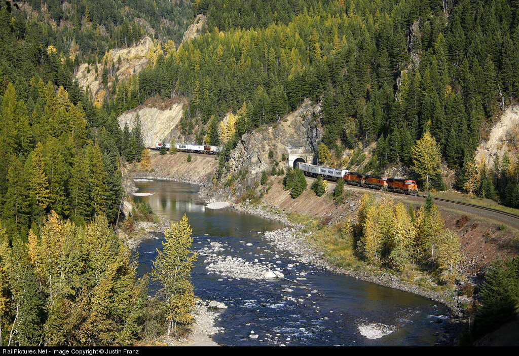| A trio of Burlington Northern Santa Fe GEs wind their westbound train through John Stevens Canyon near West Glacier, Montana on the former Great Northern, now part of BNSFs Hi-Line Sub. Just below the train is the Flathead River known for its class II and III rafting. October 11, 2008. |