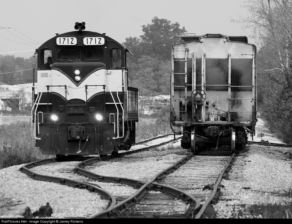 | End of the line for the Everett Railroad company. 1712 runs around a cut of cars to head back up into the brickyard. Sheetz distribution center is on the left and the crossing behind me has been ripped out but the tracks that once used to run to Cumberland still remain on the other side. |